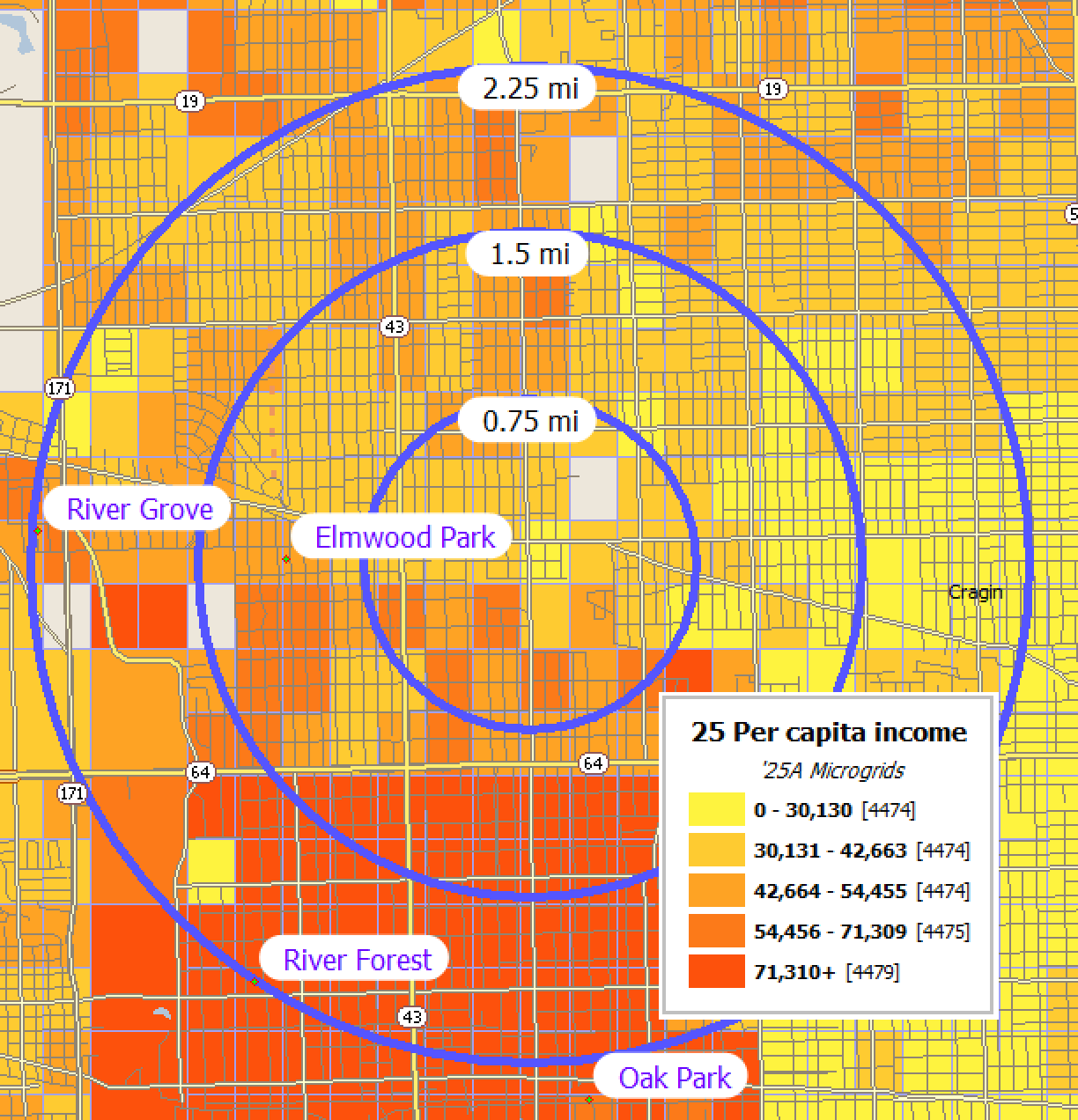 Summaries are produced for all standard levels of geography, including US, states, MSAs, places, counties, county subdivisions, Zip codes, census tracts, block groups and Scan/US Microgrids(™). Users of the Scan/US application can obtain custom summaries for user-defined polygonal areas, ring and drive time areas and any arbitrary groupings of standard geography.